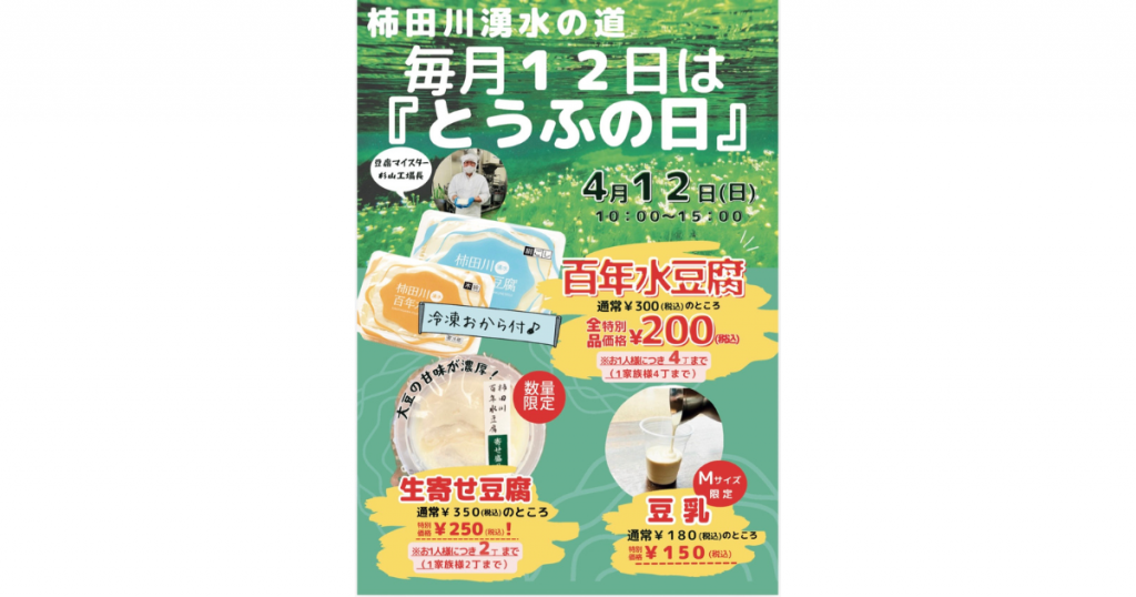 4月12日(日)とうふフェス開催いたします【開催時間10:00~15:00】豆腐館にて、・柿田川百年水豆腐全品税込み200円!!! (※お1人様につき4丁までとさせていただきます。)・百年水豆乳¥150(税込)※Mサイズ限定・生寄せ豆腐数量限定¥250(税込) ... -